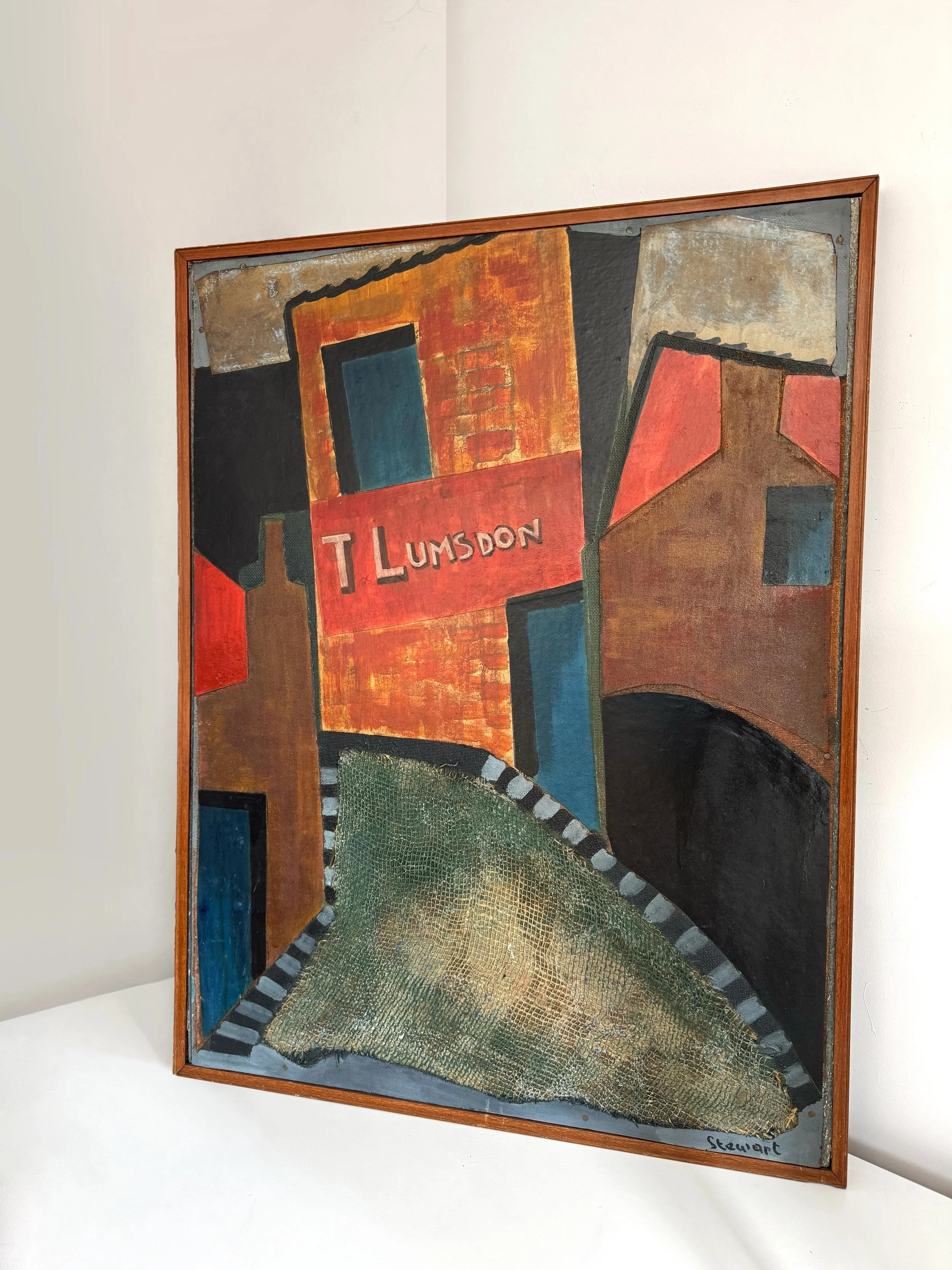 Back Lane (1966) by Ken Stewart is a unique mid-century painting with museum and gallery provenance. Bold geometric shapes and textured fabric evoke an industrial Northern England scene, with "T LUMSDON" as a focal point. Signed by the artist, it captures the raw energy of a changing urban landscape.